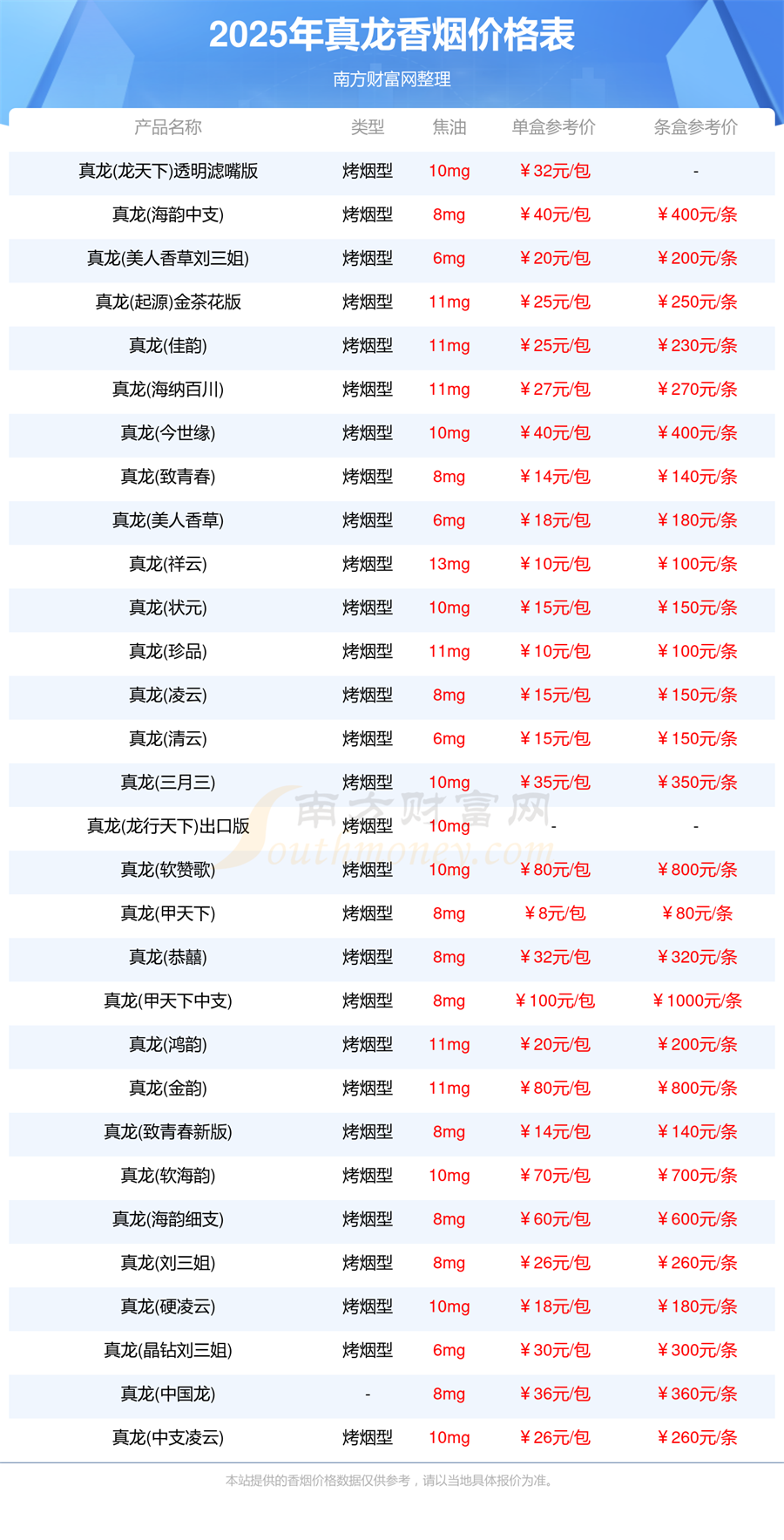 真龙(巴马天成)参考价100.0元/包、真龙(硬赞歌)参考价100.0元/包、真龙(甲天下中支)参考价100.0元/包、真龙(盛世)参考价95.0元/包、真龙(金韵)参考价80.0元/包、真龙(软赞歌)参考价80.0元/包。